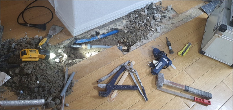 다시 청음탐지로 정확한 누수부위를 특정하고 바닥을 굴착해보니 동관인데 이미 용접으로 수리를 여러번이나 했네요ㅠ~ㅠ~